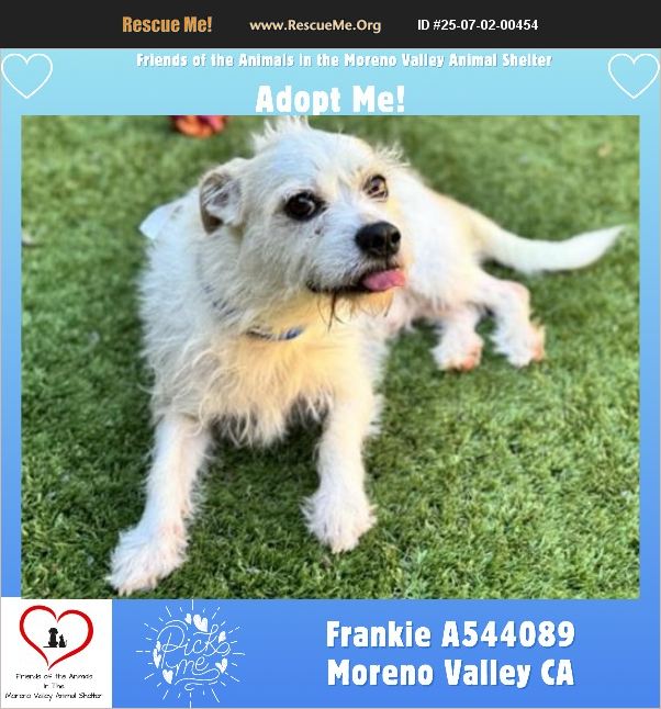 ID#A544089 Shelter staff named me FRANKIE and I am a male, white and tan Terrier mix. My age is unknown. I weigh approximately 24.60 lbs. I have been at the shelter since Jun 24, 2025 and I am available for adoption now!