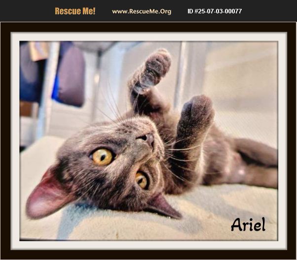 Hi! My name is Ariel. I adore chin scratches. Well, I enjoy rubbies in general. The way to my heart is to let me sit next to you, or in your lap and pet me endlessly. Oh, and tell me how much you adore me.. My age, I am about 9 to 10-months old, sleek Russian Blue mixed breed gal. I have a sister, named Aria, whose is a very intriguing dark black kitty. We have the same pursonality. Here is her link, https://www.petfinder.com/cat/aria-a-lifetime-friendship-is-waiting-for-you-77125565/nc/snow-camp/snow-camp-sanctuary-nc1102/ Toys would include cat springs, play mice, kitty balls to chase. I love, love the feather on a pole as you can see. I enjoy a small or medium cat tower. it's great to zoom up and down on and look outside. My perfect home would be a home with another kitty, but I would be ok as a single kitty. If you are interested in two kitties, for example adopting my sister and I, both. (take an extra $25 off as a discount for adopting siblings). No small kids under 12 years old. I have been with a doggie, no problem. I do enjoy watching the birds and chippy's scurry about when you are busy. Sunbathing is adored to soak in the warmth of the sun. Please come join me sometime. ok Oh, by the way, treats are welcomed and I will always say 'More please.' I have been spayed, vaccines completed, and I am micro-chipped, an added benefit of adopting from Snow Camp. Free lifetime chip registration, no annual fees. Apply to adopt online, by going to our website, Snow Camp Sanctuary, contact page, and scroll down. Then click the link that states submit online HERE, on the Snow Camp site, https://snowcampfurever.com/adoption-application or on this site, contact us. The rescue offers a two-week trial adoption to make sure I am a good fit for your home. If not, they will gladly take me back. An adoption guarantee! My adoption fee is $175, but the rescue is offering a $25 discount if I am adopted by July 15th, 2025. Bonus - the Hanes mall Pet Supplies Plus in Winston-Salem is offering an adoption bonus of 15% off coupon off everything in the store as an adoption gift to get supplies and food to bring me home with you (some items have larger discounts), too! What a deal!! The July 4th holiday weekend is here, which gives us a long weekend to get to know each other. Apply now and the rescue will give you top priority in getting us together. ok