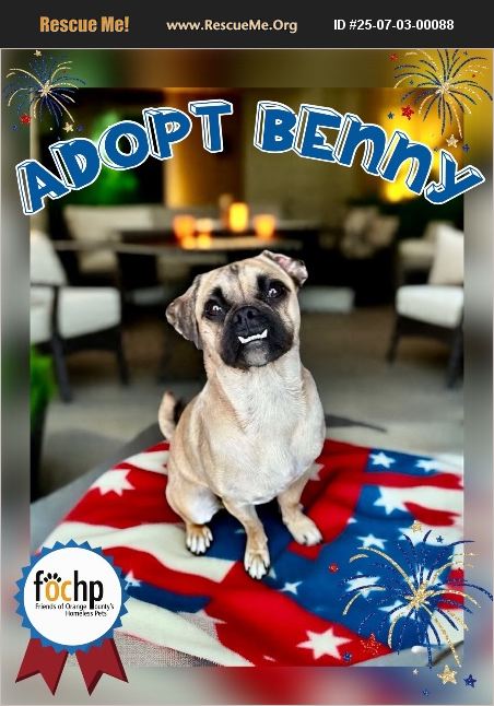 Meet Benny! ��%90 ���� Benny is a one-year-old Pug mix weighing in at 22 pounds of absolute cuteness! With his squishy little face and happy-go-lucky attitude, Benny is impossible not to love. He's the kind of dog who makes every day brighter just by being in it. Playful, sweet, and full of personality, Benny is always up for a good time-whether it's a walk around the neighborhood or snuggling up on the couch. He's the perfect mix of silly and sweet, and he's more than ready to find a forever family to share all his love with. If you're looking for a loyal companion who will bring endless smiles and tail wags, Benny is your guy!