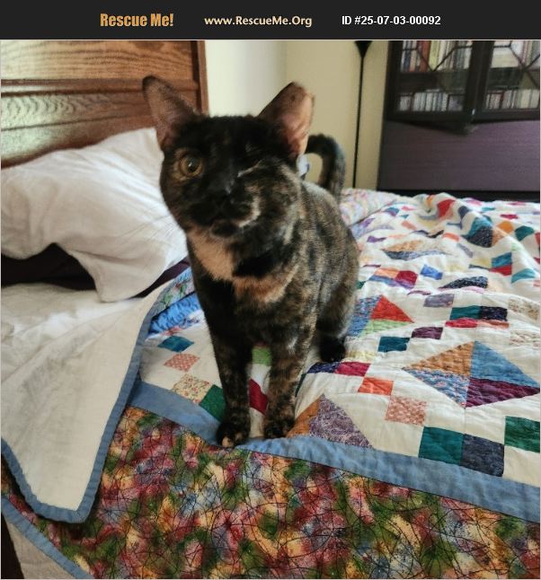 Cassie is such a sweet girl. She was born in May of 2022 and adopted as a kitten. We got a call from a kill shelter that had traced her microchip to us. She had been surrendered by her former owner. The contract they signed promised to bring her back to Feral Cat Rescue if they couldn't keep her for any reasons. They didn't honor this and as her foster mom I feel furious. How could anyone do this? Cassie has feelings. When I first got her she didn't come out of her shell for at least 3 weeks. All she did was hide. It is ironic because her former owner had called her Turtle. Now she feels comfortable and is such a joy. I am sitting in my recliner and she is on the top of the recliner by my head. She loves to sleep really close to me. She greets me when I walk into a room. You couldn't ask for a better companion. When we rescued her as a kitten from a feral colony, she had a severe eye infection and we could not save her eye. She was in great pain and our Vet thought the best thing would be to remove her eye. It had gone on too long without treatment. Now she is happy and safe. She needs someone to love her forever. Meet the available cats and kittens at the Petco in California MD on Saturdays 10-2 and Sundays 11-3 or at the Meow Dyer Cat Cafe in Leonardtown MD. Apply online at www.feralcatrescuemd.org.