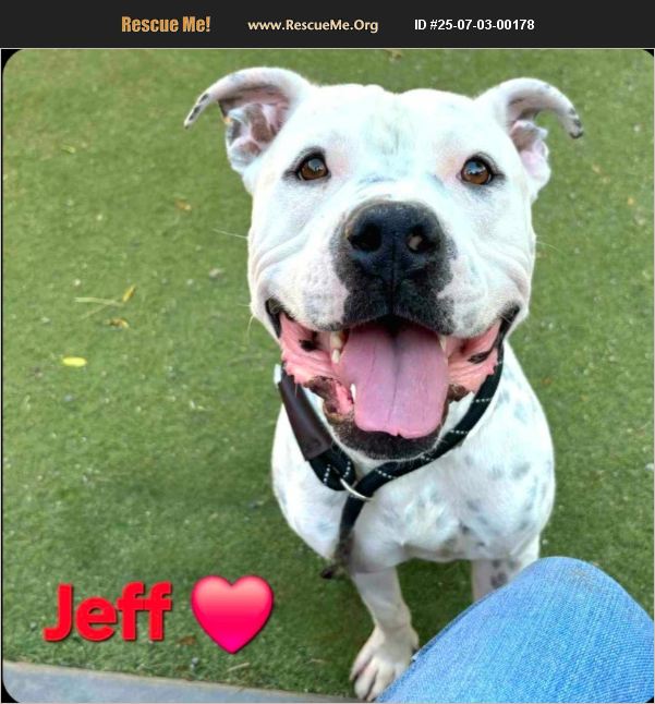 Please help me live! Mcacc Shelter has given me a deadline due to kennel stress. I have done nothing wrong so I hope you come and meet me before my deadline! LOCATED: 2500 S 27th Ave Phoenix Az Fill out: https://www.thedogsavers.org/apply-to-adopt/ Call: 480-331-4188 JEFF��%90%BE #A5144435 I'm a 1yr old 60lb Neutered-Male White/Black American Bulldog mix. Found and brought to the shelter. I got along with my finders dogs and am considered dog friendly with proper intros. I am a wiggly, happy, tail wagging love bug. I get a little excited in my kennel, once outside I settle into a calm, happy obedient pup. I walk well on leash with just some light pulling and exploring. I love adventures and walks. I like to explore but always came back to check in for pets and attention. I politely greet people and dogs along the fence without barking or reacting, and I was even curious about the water-splashed a bit to cool off. I take treats gently, know sit, and truly enjoy spending time with people. I'm an affectionate, well-mannered companion just looking for someone to come n meet me and save my life, I just cant imagine this is how it could end for me!