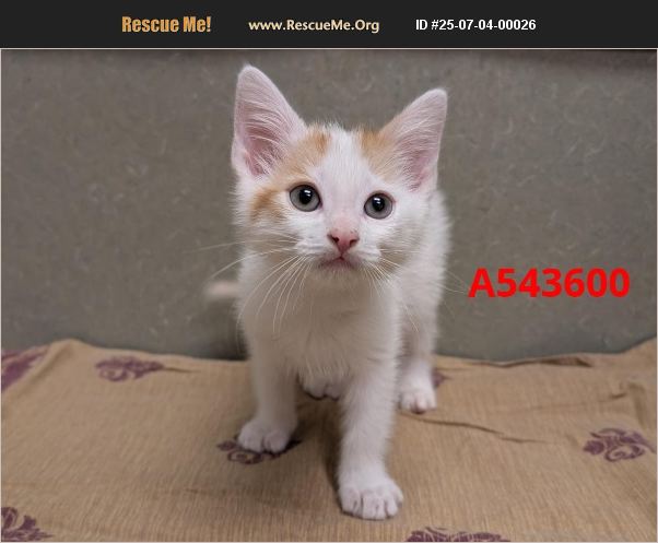 I am described as a male, white and orange tabby Domestic Shorthair. The shelter thinks I am about 9 weeks old. I weigh approximately 1.60 lbs. I have been at the shelter since Jul 02, 2025 and I am available for adoption now! Adoption hours: Tuesday - Friday 10:00am - 5:00 pm | Saturday 10:30am - 3:30 pm.