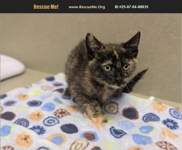 I am described as a female, tortie Domestic Shorthair. The shelter thinks I am about 8 weeks old. I weigh approximately 2.20 lbs. I have been at the shelter since Jul 02, 2025 and I may be available for adoption on Jul 10, 2025 at 10:00AM.
