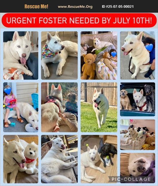 VIDEO INCLUDED: EMERGENCY FOSTER NEEDED BY JULY 10TH! PLEASE read. PLEASE share. Si's life depends on it. This is a plea for help. We are out of time. Si, a gentle and loving 4-year-old Siberian Husky, will be sent to a high-kill shelter if we don't find a safe place for him by July 10. Please don't scroll past him. Si is not just another dog. He's family. He's a sweet, calm soul with stunning crystal-blue eyes who adores children, gets along with respectful dogs and even cats, and asks for so little. He's housebroken, crate-trained, and not a flight risk. He won't even jump a baby gate. Si is everything you could hope for in a companion. And right now, he needs a hero. His owner is facing unimaginable hardship and heartbreak and is desperately trying to do the right thing for her family and for Si. What she needs is time- just 2 to 3 months of foster care while she secures safe housing. Si has a deep bond with the owner's young daughter, who cries for him every night. They're not giving up on him. They just need help. They are also willing to have Si go to a forever family to save his life. We are begging- don't let this be the end of Si's story. Please, if you can open your heart and your home to foster, foster-to-adopt, or adopt Si, reach out immediately. Even if you're not in a position to help, SHARE this post. It truly takes a village, and right now, Si needs his village more than ever. Contact Jennifer at Pumpkin Pawz Rescue (TEXT preferred): (714) 366-8170. Every minute counts. Si is literally perfect. Let's not let him down. Please share. Please care. Please save Si!