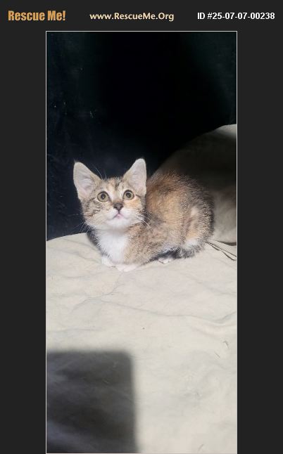 Jen is a 9 week old female kitten I am fostering through San Bernadino city shelter. She is available shy girl but is slowly warming up so she would do best in a calm house that gives her time to adjust and trust. She loves cuddles with her sister Sam and is learning to play with toys. She can be spayed for FREE through me before adoption, and all summer long her adoption fee is waived! Please consider opening your home and heart to Jen, and check out her sister Sam too, they'd love to go together, but not required.