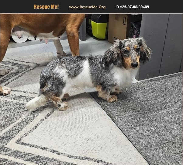 Dyno is an 8 month old long coat dapple doxie. He came to rescue yesterday as a breeder surrender. They were going to use him as a stud dog but decided his coloring did not fit into their 'breeding program '. Thankfully this sweet little boy will not be living his life in a caged barn and will now have a family to love him. Dyno is very loving. He does great with other dogs and willndo best in a home with a fur sibling. Dyno is not leash trained so he will need a fenced yard to keep him safe while outside to go potty. If you are interested in his adoption please text or email us to request an application. Please check your spam box for our reply.