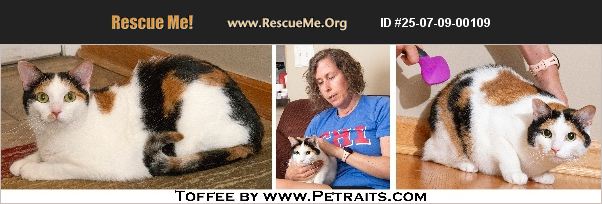 Toffee is a gorgeous, sweet, and gentle, five-year-old, 13-pound female calico cat with golden green eyes looking for a loving guardian. Born to momma Buttons in our rescue in 2020, the couple who adopted her broke up and the man who kept her moved in with a woman with allergies. So, Toffee was returned to our rescue. Toffee has already lost two pounds in the two months since she's been back in rescue. She has switched from an all dry kibble fattening diet, to a slimming canned diet. She can still stand to lose a couple more pounds. Toffee, while a tad bit shy at first, is very loving and sweet with people and other cats. She's fine with dogs who don't chase or bother her. She loves to be brushed and play with her catnip toys. She has proven to be all-around fabulous feline who uses her litter box faithfully and loves a good scratch on her scratching post. Toffee also loves crinkle toys, mouse toys, anything sprayed with catnip spay, running through her tunnel or hiding in her donut. Toffee is healthy, spayed, dewormed, vaccinated for distemper and rabies, virus tested negative for FIV/Felv, and microchipped. She is easy to hold and allows you to trim her nails. She is looking for a family that will take her into their heart and home and give her the life she deserves. To meet and possibly adopt Toffee, please fill out an adoption application https://friendsofpetraits.com/cat-adoption-application/ After the application is complete, please contact [email protected] to schedule an appointment to meet her. Her adoption fee of $175 benefits the Friends of Petraits Rescue. She is currently being fostered in Chicago. She comes complete with everything you need to care for her!