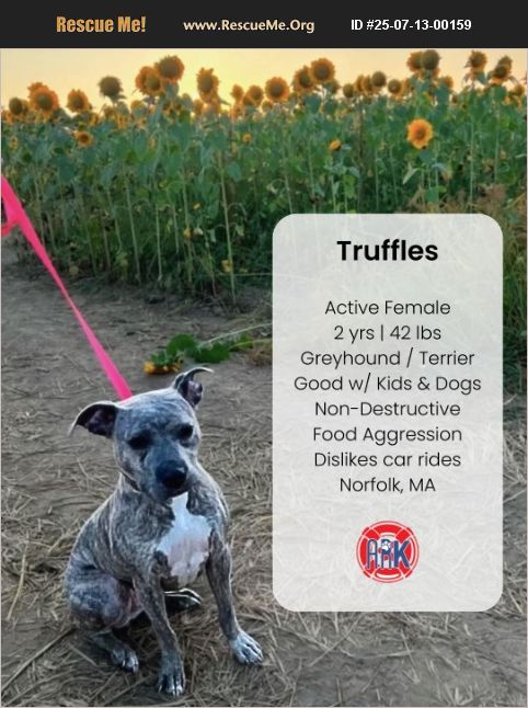 Hi! My name is Truffles! I'm a young, female brindle mix with a big personality! My way of showing affection is by kissing and giving loving cuddles. I may not know my actual birthday but my energy suggests I am between 1-2 years old. I'm a nice size and after scoring a big snack I weigh about 40 pounds. Some of my favorite activities include going for walks, sunbathing, and napping under the covers. I also love toys! Since I tend to chew them to pieces, I need some of those tough toys and bones. Don't worry, I don't chew furniture or shoes. I walk about 30-40 minutes a day so I hope to continue this part of my routine. The long trip from Texas to MA terrified me, so I'm sorry I get nervous on car rides. If you have a fenced in yard, I will run for days outside! And while I'm out there, I will always watch for the chipmunks and squirrels. I play well with the other dogs here and like napping with them, but food makes me forget my manners. I don't like other dogs near my food and prefer to eat alone. With humans, I'm smart enough to know not to bite the hand that feeds me. I'm staying in a foster home where they take great care of me, but the house is awfully crowded. Like, really full. On the bright side that means I am never without an adult around. I'm really used to human companionship all day and it would be hard for me to be in a home where I'm all alone for long periods. The best thing about this full house is the four-legged human who joined the crew. I love being around my foster caretaker's baby and licking her feet. I'm told I'm a natural caregiver. I like big people, but once in a while I meet a person who gives me bad vibes, mainly strangers (you know the type). I don't have stranger danger, but we do use a trick to help me meet people. I put on my leash and go outside in an area I won't feel cornered. The new person and I play a game of ignoring each other. Whoever does it best wins a treat! When I am ready, I'll go sniff the person and eventually I feel comfortable. I keep hearing about something called a 'forever home' and I'd sure like to have one of my own. Please contact my foster caregiver for more information and perhaps we can meet. Write to [email protected] and tell her Animal Rescue Konnection sent you! Just remember the game we'll need to play. I promise it won't take too long to show you the real me, the cute, smart, funny, snuggly, adorable, playful, pretty me! Love, Truffles xo