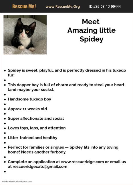 Spidey is sweet, playful, and is perfectly dressed in his tuxedo fur! This dapper boy is full of charm and ready to steal your heart (and maybe your socks). Handsome tuxedo boy Approx 11 weeks old Super affectionate and social Loves toys, laps, and attention Litter-trained and healthy Perfect for families or singles - Spidey fits into any loving home! Needs another furbody. Complete an application at www.rescueridge.com or email us at [email protected]
