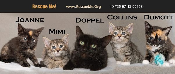 Momma Doppel came to Friends of Petraits Rescue the first week of May �'�| very very pregnant. Within days, she gave birth to four very healthy kittens on May 8th. They are all very playful, sweet and mischievous! They'd love to be adopted in pairs, one kitten with momma, or to a home with a hospitable feline. Momma Doppel is a gentle, glossy black cat with green eyes; Joanne is a silly tortoiseshell with a golden diamond on her forehead; Mimi is a tiny torbie (Tortoiseshell Tabby-mix); Collins is a tuxedo tabby with wearing adorable white socks; Dumott is a playful tortico (Tortoiseshell/Calico-mix). They are all looking for loving guardians. They are all very healthy, neutered and spayed, dewormed, up-to-date on age-appropriate vaccinations, virus tested negative for FIV/Felv, and microchipped. They are all ready for their new homes and a lifetime of love. They are well-behaved in the home, use their litter box and are eating well. To meet and possibly adopt members of Momma Doppel's family, please fill out an adoption application https://friendsofpetraits.com/cat-adoption-application/ After the application is complete, please contact [email protected] to schedule an appointment to meet him. Each feline's adoption fee of $175 benefits the Friends of Petraits Rescue. They are currently being fostered in Chicago's Andersonville neighborhood.