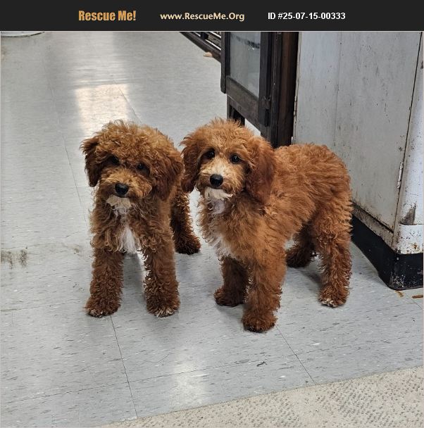 Update 8/3/25***PENDING ADOPTION***** We have held these boys for 2 different adopters to adopt. Unfortunately both adopters did not show up to adopt which left these boys in rescue longer than they should have been. Now we are on the third approved home for them to go home together. We believe these adopters are serious about giving these boys a home and are excited to meet them on Thursday. We would like to thank everyone who inquired about them and apologize to anyone who may have slipped through the cracks with a response............... Update 7/31/25*** We would like to apologize to anyone who has applied to adopt one of these little guys. When they first came to rescue we were told they were a mini Goldendoodle by transport. However we thought it was very odd that they had a short tail. After a call from the breeder that they were surrendered from it has been confirmed that they are a mini poodle and will be around 12 to 15 pounds grown. They have a birth date of 3/15/25. They were the last of their litter that didn't find homes so they were placed in rescue. They both use a doggy door faithfully out the adoption center to go potty. If you are interested in adopting please text or email us to request an application.