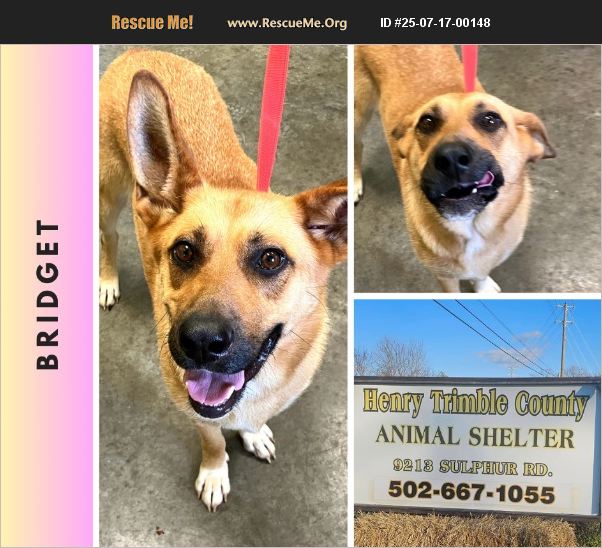 Meet Bridget 2-Year-Old Shepherd Mix | Female | Henry Trimble Animal Shelter Bridget is the total package-sweet, calm, and friendly with everyone she meets. At 2 years old, this beautiful shepherd mix has a gentle, laidback nature that makes her an easy addition to just about any home. She's wonderful with people of all ages, from kids to seniors, and she gets along great with other animals too. Bridget enjoys relaxed walks, quiet time by your side, and all the affection you're willing to give. She's the kind of dog who will fit right in, whether your household is busy and bustling or calm and quiet. Bridget is currently available for adoption at Henry Trimble Animal Shelter. If you're looking for a loving, easygoing companion who's good with everyone, come meet Bridget-you won't be disappointed.