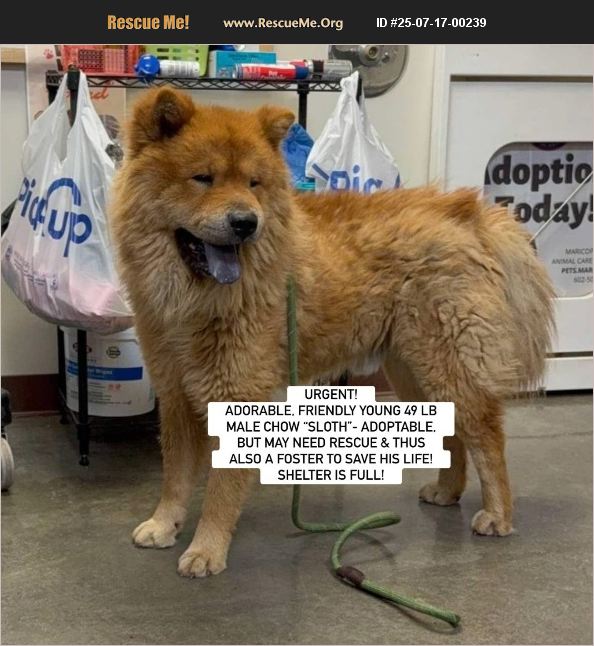 Courtesy posting: URGENT at PHOENIX, AZ- ID #A5147601 - MARICOPA COUNTY ANIMAL CARE (WEST VALLEY) - ADORABLE, FRIENDLY YOUNG 49 lb MALE CHOW 'SLOTH'- ADOPTABLE, BUT MAY NEED RESCUE AND THUS ALSO A FOSTER TO SAVE HIS LIFE! SHELTER IS FULL and puts many chows on their euth list suddenly. Please help us find a good home or foster and rescue for this adorable boy the shelter fondly named Sloth. He has was found as a stray, and is estimated to be only 3 years young, and perfectly sized at only 49 lbs. He is available to be adopted, but we are also looking for a foster we can refer to a rescue. We had a volunteer meet Sloth who provided us several nice video showings him very sweet. Sloth also has positive Shelter notes that state, '07/16/2025 Solicited attentions, Easy to pull from kennel, Easy to return to kennel, Takes treats nicely, Somewhat Pulls on Leash, Calm, Ignored dogs when walking past kennels, Sloth is a shy but sweet boy. He takes a few minutes to warm up and seems anxious in a loud environment, but once we went out for a walk away from the noise of the shelter he calmed down substantially. Takes treats nice, allowed petting all over and hair plucking.' Unfortunately, the shelter does not dog test, but he can perhaps be walked by other kennels. For a copy of full behavior and medical notes, please go to: https://apps.pets.maricopa.gov/adop.../Home/Details/A5147601 His listing link is: https://apps.pets.maricopa.gov/adoptPets/Home/Details/A5133174 If you may be interested in adopting, please contact the shelter directly at (602) 506-7387, ask for him by ID. Adoptions are currently only $50 currently. My adoption fee is quite the deal! Not only do you get my unconditional love and a new BFF, it includes my spay/neuter surgery, vaccinations, microchip, and even some cool coupons! Please note we are looking also looking for foster in case he does need rescue, or someone who may want to foster to adopt him. If interested in fostering, fostering-to-adopt, or helping in some other way (ie., pledging for his rescue), please also contact [email protected] asap or Southern California Chow Chow Rescue Network who is trying to find placement. We will try to pair fosters or interested parties with a rescue group. Rescue groups may contact the shelter directly at [email protected] and by calling 602-506-7387 and providing the ID. We will be posting videos, additional pictures and updates on facebook here: https://www.facebook.com/debbie.alder.14/posts/pfbid02y2GdXb3BBqNE5ASHGgdDviaxDohoh48SGLgraBdYHoV2Fm9X7idNbzppQCJRg76El Note: to view contents of links you will need to copy and paste each one separately into your browser.