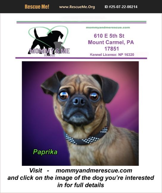 Please fill out an application here ) https://mommyandmerescue.com/adoption-application/ and give your vet clinic permission to speak with us. Spayed/Neutered, UTD on vaccines, Chipped Adoption fee 400 You must submit the application and be approved prior to meeting one of our dogs. Please add our EMAIL to your contacts! [email protected] Kennel License: NP 16320 Paprika Pug Mix 2 years old WEIGHT: 10 pounds Paprika is sweet and shy when meeting new people. She came to us with several other dogs so she is hoping for a family who has another dog to be friends with. She is ok with older kids. She is house-trained and crate-trained. Paprika walks well on a leash and enjoy being held.