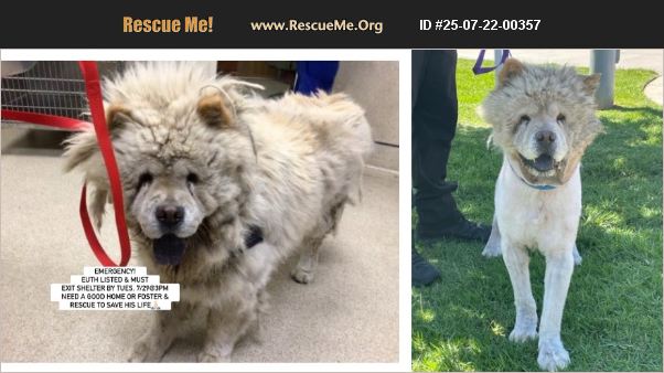 Courtesy Posting: CODE RED/EUTH LISTED-AT RIVERSIDE, CA (JURUPA VALLEY)- Riverside County Shelter, So Cal - ID #A1869879 - 'PUFF DADDY' aka 'FALCOR'- AN INCREDIBLY HANDSOME CHOW AT RISK IN HIGH KILL SHELTER WHICH IS FULL - FOUND AS A STRAY IN VERY MATTED CONDITION- Shelter update says, 'Declining in shelter environment. ***DEADLINE- MUST EXIT SHELTER BY TUES 7/29 @ 3pm***' HELP!!! THIS STUNNING BOY CAME OFF HIS STRAY HOLD ON 7/23. HIS OWNER NEVER SHOWED. THIS SHELTER IS OVERFULL and EUTHANIZING YOUNG ADOPTABLE DOGS, AND THIS ADOPTABLE BOY WAS PLACED ON THE EUTHANASIA LIST WITH A DEADLINE AS NOTED ABOVE. WE ARE THEREFORE DESPERATELY LOOKING FOR A GOOD HOME, OR FOSTER AND RESCUE TO SAVE HIS LIFE. RESCUES NEED FOSTERS TO HELP! Puff Daddy as the shelter originally named him, and then changed his name to Balcor, may have been used to breed given his pedigree looks. The shelter estimates he is 4 years old and weighed 66 lbs originally. The shelter also told us, he 'was severely matted and was sedated for grooming. He did not come in with another dog. Notes state dog is kenneled alone. No interest in interacting with handler.' A shelter volunteer then took him out in the yard and said, 'we didn't do a dog test, just because he's pretty iffy with people. But we put him up against kennels with dogs barking in his face and no issues! We put him in front of a bunch of crazy littles who were barking in his face. No growling or lunging! No snapping!' Even though he did not exhibit negative issues towards dogs, and was being a typical chow in a shelter with people, the shelter sadly added him to the euthanasia list the very next day, alleging he was declining in the shelter. If you are interested in adopting Puff Daddy/Falcor, please contact the shelter immediately by calling (951) 358-7387 and reference the applicable ID and also use his listing link to express interest: https://24Petconnect.com/DetailsMain/RVSD/A1869879 If you are interested just to foster, or foster to adopt, or if you need further help, please contact [email protected] or Southern California Chow Chow Rescue Network asap as we are trying to find a foster we can then refer to a rescue group to save him in time. If you are a rescue group and interested in pulling this stunner, please email the shelter right away at: [email protected] and call (951) 358-7302. Puff Daddy/Falcor will be neutered for a home. We will be posting any additional information, pictures and videos on facebook at: https://www.facebook.com/debbie.alder.14/posts/pfbid0XH3XxNvZu4qZM2khJCFxbuDoMvL4xG6kS3rgPJMxxMezL8TeJXJC5t1oL4Q9fnXql Note: to view contents of links you will need to copy and paste each one separately into your browser.