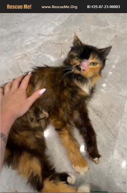Pintis is a beautiful calico with gorgeous green apple color eyes.Lived at our condos garage for many years. She has mosquito bite and food allergy and this summer bugs just messed up her nose and ears.She is now indoors with a foster and is enjoying the ac, no loud noises, no bugs around and loves the attention.She eats broil chicken with pate.She is very friendly, uses her liter, let's you brush her hair and likes to play.Needs a loving home.Preferible the only pet at home.She is at Sunny Isles Beach, FL.(786)278-8171