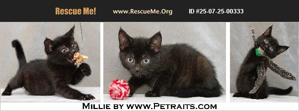 Millie is an adorable, sweet, friendly, and playful eight-week-old, 2.1-pound, female, green-eyed, plush black kitten looking for a loving guardian. Millie was found stray in New Carlisle, Indiana, with seven other kittens. She loves people and other cats and would love a home with one of her foster siblings Mally, Mason, Marisol, Merlin or Margo, or to a home with a resident feline friend. Milie is well-behaved in the home, uses her litter box, and loves jumping for a cat dancer or feather toy, or rolling with her toys! Millie is very healthy, dewormed, treated with flea preventative and will be ready for adoption after her spay surgery and vaccines on July 28th. To meet and possibly adopt Millie please fill out an adoption application https://friendsofpetraits.com/cat-adoption-application/ After the application is complete, please contact [email protected] to schedule an appointment to meet her. Her adoption fee of $175 (or $300 as a pair) benefits the Friends of Petraits Rescue.