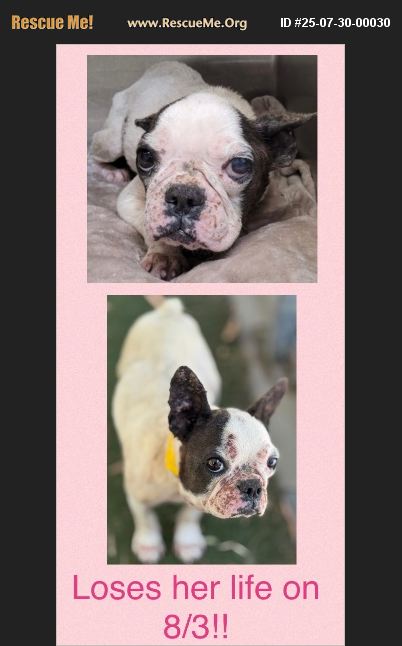 URGENT!!! South LA Shelter, Orange Alert!! Sweet French Bulldog, Mango is in Urgent Medical Need & is Scheduled to be Euthanized on 8/3!! Video: https://drive.google.com/file/d/1UclHmZfQip79qFYg4_mMF6d5NeyttXvp/view?usp=sharing Mango,A2211187, is a 6 year old, 11 pound, Female. Arrived at the shelter a Stray on 7/24/2025. Medical Alert: Had an allergic reaction vs other. Right side of face and neck severely swollen. Lymph nodes swollen. Chronic skin infection and Chronic ear condition. Needs out of shelter by end of day by 8/3/2025 Sunday, 4PM. If a dog's condition declines, it could be euthanized at any time. Jasmine Poblano Animal Care Technician Los Angeles Animal Services Chesterfield Square Animal Services Center 1850 W. 60th Street Los Angeles, CA 90047 W: (888)452-7381 E: [email protected]