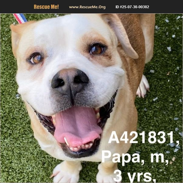 FREE ADOPTIONS THROUGH AUG 8! * weighs 45 pounds * heartworm negative * not yet neutered but he will be * came in as a stray wearing a harness * greets with smiles, wiggles, and tail wags * quiet and calm in and out of kennel * walks well on leash * appears to be housebroken * loved exploring and sniffing in the yard * gentle treat taker, well mannered * friendly, happy, lovable * big fan of back rubs Papa is a good boy who is full of personality and love! He gives the best smiles and he really enjoys hanging out with you. He was easy to handle and followed along beside me as he explored the yard. He would make a great walking buddy. He has good manners and was well behaved at all times. He's a gentle treat taker and will sit for them. Papa is dreaming of a comfy bed to snuggle on and endless pets and love. Transport help may be available.