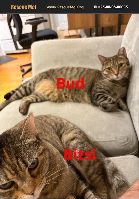 Bitsi - The Social Butterfly Location: New York City 10002 Name Bitsi Age / Birthday 9 yrs �'ۢ July birthday (we celebrate with extra chin scritches!) Breed / Coat Domestic Shorthair - brown tabby swirled with a hint-of-tortoiseshell sparkle Sex / Spay-Neuter Female �'ۢ spayed Microchip Yes, registered Vaccinations Last full series July 2022 (rabies & FVRCP) - rabies good through 2025 Feeding Routine Five small dry-food portions dispensed 24/7 by an automatic feeder �'ۢ one wet-food 'special' each evening (she'll chirp to remind you) Personality Snapshot Life-of-the-party greeter, chatty couch companion, pro head-bumper. She'll hop into video calls, insisting the team meets its cat-cuteness quota. Favorite Stories �'ۢ When guests arrive, Bitsi trots up, rolls onto her side, and demands pets before coats are off. �'ۢ Her 'executive hammock' on the cat tree is command central-she surveys the room like a benevolent queen. �'ۢ During family movie night she weaves through laps until she finds 'the perfect pillow' (usually yours). Habits & Needs Loves high perches, sunbeams, and sisal scratching posts. 100 % litter-box reliable (clumping clay or corn-she's easy). Ideal Home Any household that enjoys a sociable, affectionate cat-respectful kids and friendly pets welcome. Reason for Rehoming A recent housing change means less space and attention than Bitsi deserves. Our love for her is unchanged-only our circumstances. ��%90%BE Bud - The Gentle Late-Bloomer Looking for Peace & Treats Location: New York City 10002 Name Bud Age / Birthday 5 yrs �'ۢ July birthday Breed / Coat Domestic Shorthair - classic brown tabby stripes Sex / Spay-Neuter Female �'ۢ spayed Microchip Yes, registered Vaccinations Last full series July 2021 (rabies & FVRCP). She's vet-shy, so future visits need patience & a calming carrier cover. Feeding Routine Shares the same auto-feeder schedule; nightly wet-food serving (she'll politely wait until you're watching, then dig in). Absolute sucker for ANY treat-great for bonding. Personality Snapshot Quiet observer who blossoms with gentle encouragement. When all four paws are flat she's still assessing; the moment a paw lifts she's warming up-and soon she's purring in your lap. Favorite Stories �'ۢ After years of inch-by-inch trust-building, Bud climbed fully onto my lap last week-tail curled, eyes half-closed. A victory we won't forget. �'ۢ Her name 'Bud' is our little joke: she wasn't a flower yet when she arrived, but she's blooming beautifully now. �'ۢ She'll bolt to her hidey-hole during thunder, but crack the treat jar and a tiny tabby face peeks around the corner almost instantly. Habits & Needs Scratches on flat pads or cardboard loungers. Litter-box reliable, though she sometimes forgets to cover-an easy fix with a top-entry box or extra litter depth. Loves sunny windows, couch snuggles, and tall shelves where she can watch safely. Ideal Home Calm, patient adults (or older kids) who celebrate small wins. Another gentle cat role-model could help, but she'll thrive solo, too. Reason for Rehoming Same as Bitsi: our new living situation can't provide the quiet consistency Bud needs to keep blossoming. Finding her a peaceful forever home is the most loving choice we can make.