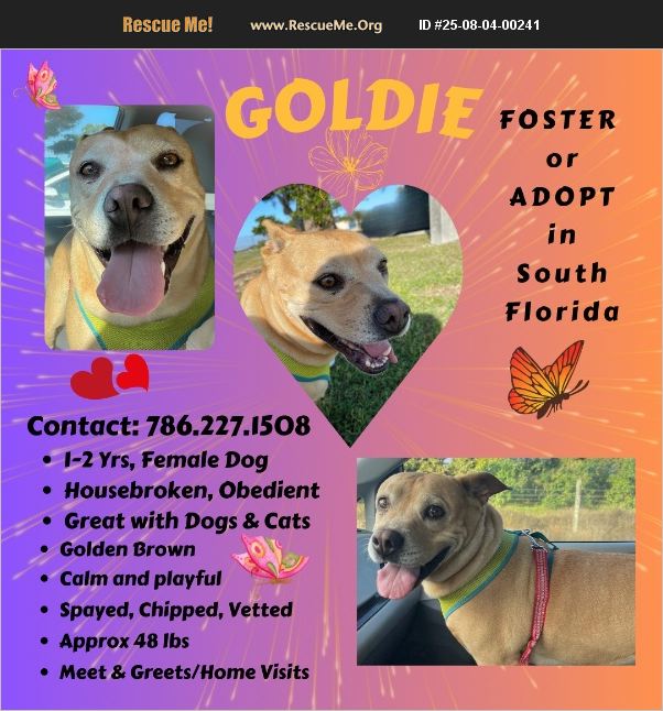 Goldie was abandoned at a carwash in Miami - with a cat - late 2024. A kind Samaritan decided to help w her rescue (as the kind soul who found the pair were unable to find an official rescue to take her in) and she was vetted and placed in boarding while they looked for an adopter. No luck so far...and her boarding place is no longer able to keep her. We don't know how she actually is with cats in general. She's a strong girl...and could do with a home where she can decompress from the very busy boarding - and also be with someone who can be patient and structured with her. Any and all costs for Goldie's care and needs FOR FOSTERING will be covered by the finders and their Good Samaritan. The Good Samaritan would appreciate a small adoption fee/donation to cover some of their expenses. Meet and Greet, Home Visits, Adoption Forms are REQUIRED.