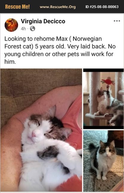 Maximum it was my husband's cat and he passed away 3 years ago I just retired and I'm quite busy with volunteer at working things and I feel that he would be better with maybe an elderly couple of single elderly adult children not young children and no dogs he's a loving cat he does no scratching no counter surfing he's just wonderful just breaks my heart