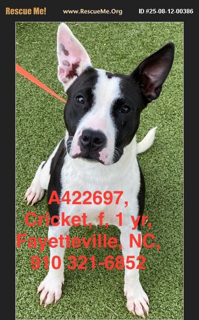 * petite and weighs just 35 pounds * brought in as stray * not yet spayed - she will be upon adoption * heartworm test is pending * ready to greet you at her door and quick to be friends * calm and quiet in an out of kennel * explored a little but mostly wanted to be right near me getting love * loving, happy, friendly, social, playful * affectionate - she curled right up in lap for back scratches and pets. she didn't mind being held and getting pets * very gentle treat taker and gives kisses! Cricket is an all around good girl. She loves everyone and seeks your attention. She enjoys back scratches, ears scrubs, and she's a big fan of endless belly rubs! This sweet little girl misses the comfort and love of having a home and a family. She's hoping for a new beginnings with a loving family. Can you open your heart and home for sweet Cricket? Our shelter is full and she needs a home quickly. She's at Cumberland County Animal Services, Fayetteville, NC 910-321-6852