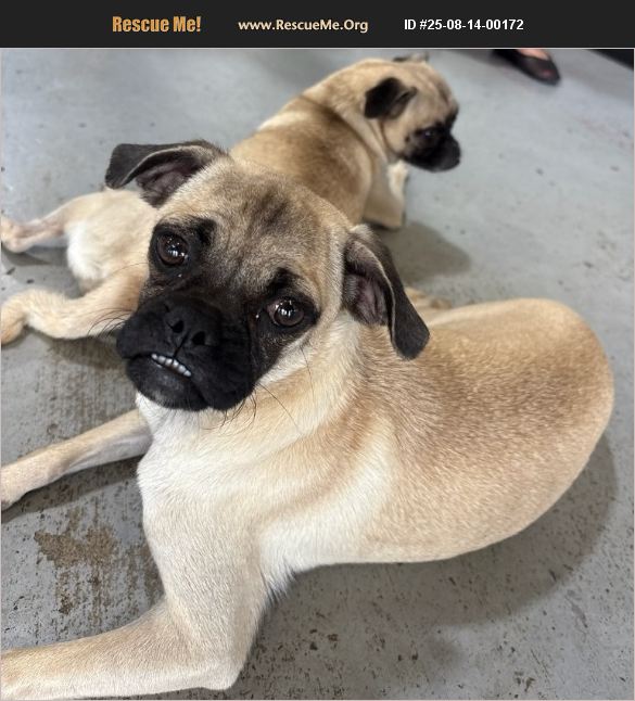 PUDDIN' and her mother PEACHES are 2 pugs that were dumped early one morning at a local car dealership. Luckily there were some employees who are dog lovers and took them in for a little while until I was able to pick them up. As usually we look for the flaws in a dog if it was intentionally dumped but very few times do we find any. That certainly is the case with PUDDIN' & PEACHES, there is absolutely nothing wrong with them. Each of them is very happy, PEACHES is the more social butterful and PUDDIN' is more reserved. They love each other and love to be with each other although they do play and interact with the other foster dogs in the home. PUDDIN' is 9 months old and 14 pounds. PEACHES is 3 years old and 13 pounds. They both like to cuddle and get head rubs but PUDDIN' lays on her back to get a belly rub. PUDDIN' is also the one with the slight underbite that makes her look just that more special. They already walk well on a leash and ride in the car without getting sick. And on the plus side they are not yeppers, no barking or whining, just running around playing and kind of submissive. I would love for them to be adopted together but to separate them there would have to be another playful dog already in the home that is interested in one of them. Neither of them would do well as an only dog. Their activity level is normal, nothing hyper but they do love to run around the backyard playing with each other and toys. If you are interested in adopting PEACHES and/or PUDDIN', please submit an application on the website below. Thank you for your interest. www.roxysk9rescue.org
