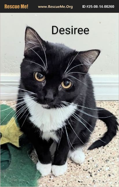 Desiree is an 18-month-old female Tuxedo kitty. She is gentle and easy to get along with. She will welcome your pets and sit by you. She is spayed, Up To Date and microchipped. To meet pretty Desire call, text or email 239-851-3485 [email protected] or visit our website at https://www.saveourstraysfmb.org. Rescue is located on Fort Myers Beach. Due to the distance we have to travel, we adopt to homes in Fort Myers Beach, Fort Myers, Cape Coral, Punta Gorda, Estero, Bonita Springs, and Naples