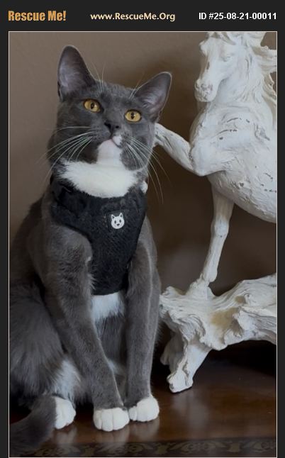 With the most intriguing, golden eyes and sleek frame, Bugatti is quite the charmer. Her shiny, blue-grey coat is set off by her snow white mittens and chest. She was born in April 2024 and is bonded with her friend, Denali. They enjoy everything from chasing invisible butterflies, running through the tunnel after balls, jumping onto high window ledges for bird and squirrel watching to snuggling at night. Dry food is available 24/7, and wet food at supper time is the best. Bugatti loves her belly and cheek rubs and is not hesitant to come to you when she's in the mood for one. Although sweet and loving, it's mostly on her terms; she is learning to trust that nothing bad is going to happen when picked up. It was evident that she had no fear of dogs at such a young age and definitely a strong sixth sense. During a severe tropical storm, she came and laid by our terrified and trembling Boxer until the storm had passed. I had never seen anything like that. Fortunately, She and Denali were HUMANELY DECLAWED. The Vet that declawed them ($1000 for both) did an amazing job and DID NOT cut off the knuckle or joint. When they returned home and jumped out of the carrier, I questioned if anything had been done. There was no evidence of any type of pain or discomfort. Bugatti and Denali are to be rehomed together. The PRICE reflects BOTH BEING ADOPTED and a very minimal cost for procedures but mostly to ensure they will be truly loved. You'll be quite happy with these two amazing girls.