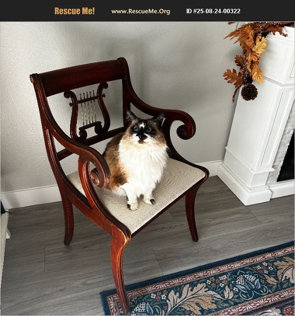 Freya is the SWEETEST ragdoll cat. Shes about 5 years old and loves to sleep on laps. She is very quiet but when she wants treats she has a very quiet chirp like meow. Extremely docile and loves to be picked up and held. Unfortunately she has stage 1 kidney disease and has trouble urinating in her litter box. I think she would be a PERFECT indoor/outdoor cat where she could urinate outside, but I live in an apartment and I can't accommodate that. She's on a prescription diet and takes gabapentin twice a day.