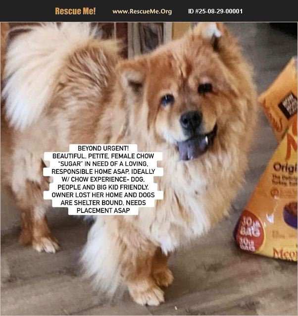 Courtesy Posting: BEYOND URGENT- HUMBOLDT, AZ (between PHOENIX AND FLAGSTAFF)- BEAUTIFUL, PETITE, FEMALE CHOW 'SUGAR' IN NEED OF A LOVING, RESPONSIBLE HOME ASAP, IDEALLY W/ CHOW EXPERIENCE- DOG, PEOPLE and BIG KID FRIENDLY. OWNER LOST HER HOME AND DOGS ARE SHELTER BOUND, NEEDS PLACEMENT ASAP Please help us find a loving, responsible home (or foster, if you are local) for Sugar who lived with her owner since a young puppy. The owner lost her home and the dogs are only at a temporary place outside in this extreme heat. and could be shelter bound soon, along with several other chows from the same home. Sugar is now approximately 4 years old, spayed and weighs 40 lbs according to her owner who also had told us 'She is friendly with other dogs, she does well with older children but not with younger children, she chases cats but has never harmed one. She doesn't really like younger children. She is potty trained and has a dog door to go in and out as she pleases she spends most of her day time outdoors and night time indoors'. Prior to her being spayed, the owner let us know she got out and ended up having an unplanned litter, and 'nipped at a stranger that was near her fresh litter of puppies but didn't break the skin and haven't had any issues before or after the litter of puppies were re-homed.' If you are interested in meeting and adopting Sugar, or may consider fostering her for the owner or a local rescue, please contact [email protected] or Southern California Chow Chow Rescue Network asap who is assisting the owner with her and the other dogs' placements. We have separate posts up for the other chows who may be adopted separately. Chow or dog experience is preferred. If you have another dog or pet, a meet and greet is strongly advised. All adopters will be asked for a home check (which may be virtual), an application, a vet reference and an adoption contract. We will be posting more pictures and videos on Sugar of facebook at: https://www.facebook.com/debbie.alder.14/posts/pfbid0xVVqQpvXqTFZ57wqqkXtJ1B2DydrMDPWwMKiGLcU2hjcYHrc7vymWCb5gXZ5tjFSl NOTE: to view contents of links you will need to copy and paste the link into your browser.
