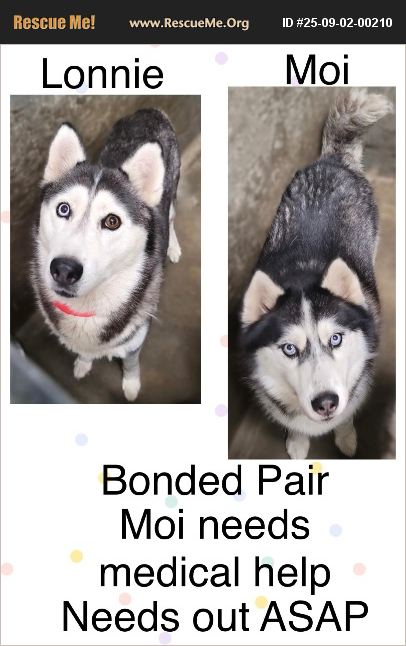 Moi is in need of rescue or adoption. He's been on our medical alert list since 06/19/25!!!! He needs medical help ASAP & out of the shelter before he is euthanized!!! He is part of a Bonded Pair so they both need saving!! Video: https://drive.google.com/file/d/1N-0_77tjVGeBQHK59SXvoSBzACURRXVg/view?usp=drive_web Moi #A2204319, 7 years old, 75.4lbs, Male/Neutered. Came to the shelter as a stray with Lonnie #A2204320 on 06/19/25. If you can help Moi or need more information, please contact: Lucy 213-655-7613 Goldie 213-264-8988 Medical notes: Moi is a nice dog & was reported to have had a minor seizure on 8/14/25. If seizures persist, will need to euthanize for medical. Moi also has a bonded pair, and there appears to be some anxiety if they are separated. His Best Buddy is A2204320 Lonnie. Lonnie is a female Husky, Adult: 3 - 6 yrs., 64 lbs. Lucy Ruiz Lifesaving Liaison/Foster Coordinator Los Angeles Animal Services East Valley Shelter 14409 Vanowen St Van Nuys, CA 91405 Cell: (213) 655-7613 Txt or call E: [email protected]