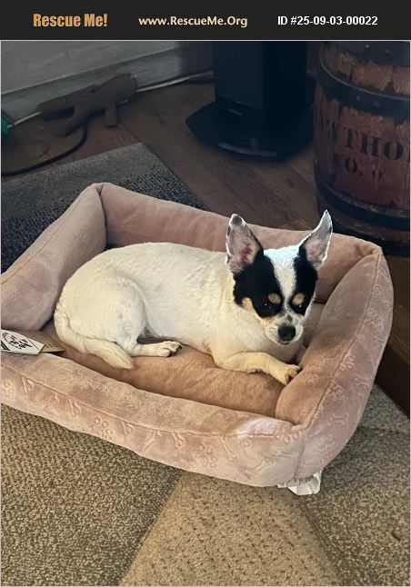 Sparkles is a 6.5 year, female, tri-color, chihuahua who weighs 6.5lbs. Sparkles was an owner surrender when her owner went into assisted living. Sparkles is a quiet little girl who will quickly become your shadow. Once she feels secure, she will follow you around the house and sleeping in the bed is a definite requirement. She is a good sleeper and wants to be with you. Sparkles just had a dental and had four teeth pulled. Other than being a picky eater until you figure it out, Sparkles is healthy and ready for her forever home. Sparkles walks well on a leash, but loves and thrives in a big yard. Adoption fee $400