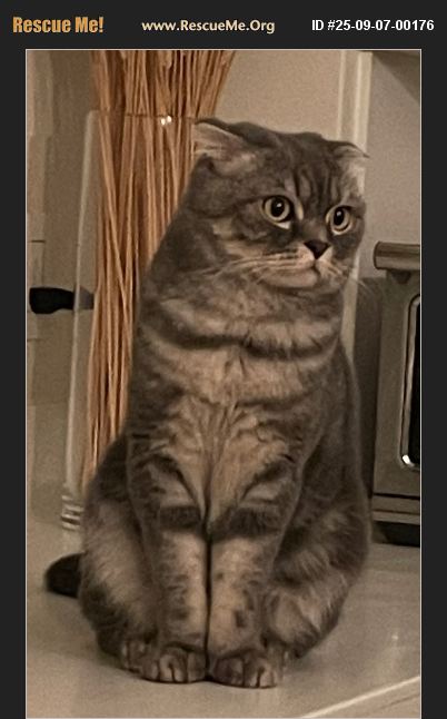 Meet BB, a stunning 7 year old blue Scottish Fold with a gentle, affectionate personality and those signature folded ears that make this bread so unique! This purebred indoor-only gentleman is looking for a new forever home due to a change in our circumstances. Our youngest child left home earlier than expected and with my worsening allergies and that we are moving/downsizing apartments, we think it is the right time to find a new home for BB and bring joy to a loving family who can provide the comfort and companionship he deserves. He is a Purebred Scottish Fuld and we have documentation from the breeder. He has a beautiful solid blue coat, is sweet and loyal. He loves to follow his humans around and relax on cozy perches. He's quiet but expresses gratitude with soft chirps and gentle rubs. He doesn't like loud or high stressful environments. In these situations, he will find a cozy, private space. He is neutered and even microchipped and we have the documentation to prove this. We never activated the microchip. BB likes his scratching post and cat tree. His hair is short. He eats Blue Buffalo Wilderness High Protein food for cats. We want to make sure he will go to a loving environment.