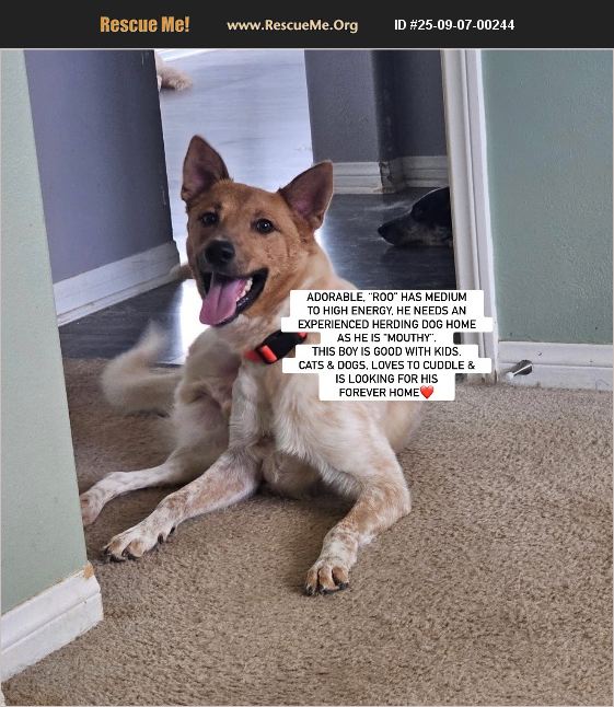 Courtesy Posting: 'ROO' Saving Gizmo's Friends Menifee, So Cal 'Roo' is a 1.5 yr old, soon to be neutered, adorable cattle dog boy, with medium to high energy, who needs an experienced herding dog home. Not because he is needing training, not because he isnt good with kids or cats or other dogs (obviously he's great with all those).. it's because he's extra mouthy and I don't want the wrong person to call a nip a bite. It's just his breed. My kids get nipped all the time but they were raised with cattle dogs and know to tell them stop and disengage before an overexcited cattle dog gets too rough. That's what Roo will need if placed with a family who has small kids. He walks well on a leash, is still learning basic commands, hasn't had an accident in the house for 2 days now, I think his prior accidents were mostly a territorial thing (working on getting him a neuter appointment asap). He is actually learning the ropes of house manners pretty well. He just needs that training to be continued. That's a basic run down of him training wise. Personality wise, he's a goofball. He loves to cuddle and loves treats and chasing a ball around (I would say it's almost fetch but he wants you to chase him around to get the ball back lol). He is a total velcro dog and wants to be in the room with his person even if that means sitting in the bathroom with you while you potty or shower lol. He's the most textbook cattle dog in the world. High energy, velcro dog, mouthy, and needs to be stimulated physically and mentally. So any experienced cattle dog owner is going to understand that. If you are interested in adopting him, please email: [email protected] We have more photos and videos of him on his Facebook page at: https://www.facebook.com/debbie.alder.14/posts/pfbid0JozRP6V1DixAjGswRisbuVkJgNVHyv1VeGNs5YjAXS25Nczx5zzw7Hh4zsaKQw3Cl Note: to view contents of link you will need to copy and paste it into your browser.