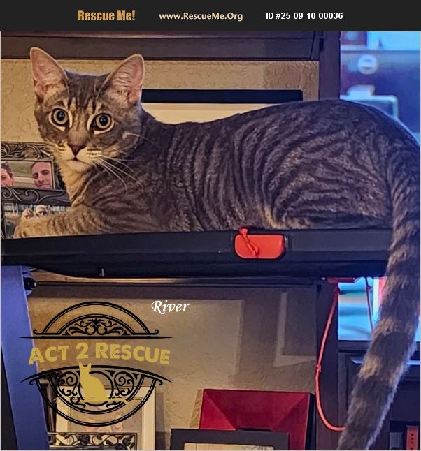 Hey there, I'm River! I might be a little shy at first, but once I get comfortable with you, I'm all about cuddles, naps, and playtime! When I first arrived at my foster home, I was a bit nervous and needed a little space to adjust. But within just 24 hours, I was already napping on my foster's lap, so it didn't take long for me to feel safe and loved. I'm a playful boy at heart, especially when it comes to my foster brother! We love running and jumping all around the house, chasing toys and each other. But when it's time to relax, I'm just as content. You'll often find me napping by the window, watching the world go by, or curled up on the couch for some cozy downtime. I have a pretty laid-back personality, but there's one thing that really gets me excited... the sound of a can of cat food opening! I'm a very good eater, and not picky at all-I'll finish my food (and sometimes my foster brother's too, if he's not looking!). My appetite might surprise you, but I promise I'm all about good meals and belly rubs. I'm a big sweetheart who would do best in a home with older children who understand that I need a little time to settle in. Once I'm comfortable, you'll have a loyal and loving companion who's always ready to give affection, play, and be your best buddy. I am all ready for my new home. All I need now is you! I am currently living in a foster home and am fully litter trained. Act 2 Rescue will even help you make sure I am able to integrate into your human and pet family with their behavioral coaching support during the transition period. I can't wait to meet you so please fill out an application for me today! www.acrt2rescue.org