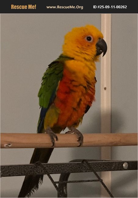 Hi this is Bobby his a sun Conure. Bobby doesn't let no one touch him but his a great bird he needs someone that's going work with him. I haven't had the time for him anymore with my job keeping me away from him more. If you need any more information please send me a message. Please look at the adoption fee before reaching out thank you