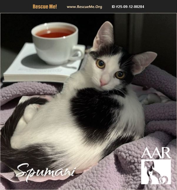 Spumoni is a sweet female kitten. In foster care she loved to be petted while she was in her cage, and would run and play when she got to go into the foster's cat playroom. Spumoni loves to be petted and will reward you with many purrs.