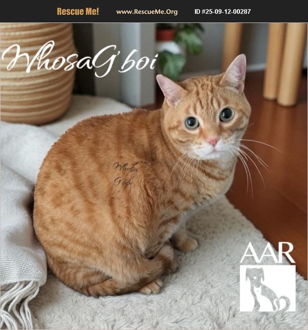 Whosa G'Boi, (short for who's a good boy), is a calm, handsome, and affectionate cat. He likes attention from people and especially loves belly rubs. We're sure Whosa G'Boi misses having a home. Hopefully his new person will come soon and adopt him!