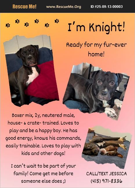 Knight is a great dog and will make an amazing companion. Knight has great energy and is ready to play and have fun. He loves to play with his stuffed toys, go for runs and walks, and play with my dog. Knight will thrive in an active home with other dogs and even kids. He knows basic commands including sit, down, off, break (release), and leave it, among others. He is house-trained and crate-trained. Knight knows how to heel and does good on runs; he is working on knowing the command. Knight is neutered, up-to-date on vaccinations, and is microchipped.