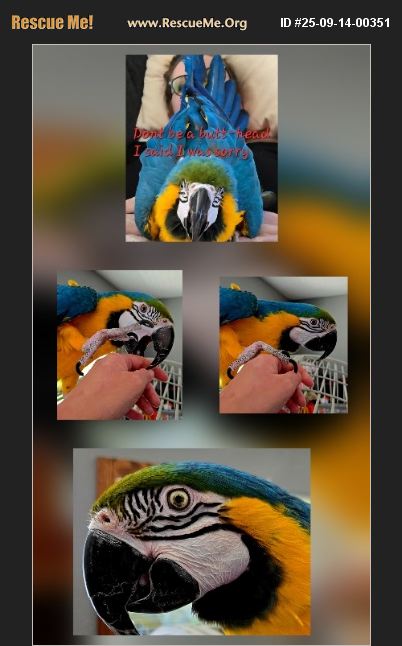 Cage and carrier included. 30 year old female Roxy is a beautiful adult Blue and Gold Macaw with a gentle soul and a resilient spirit. Though she has had a a traumatic past and sustained an injury that prevents her from flying she is still full of life and love. Roxy thrives outside of her cage especially when perched in a peaceful patio setting where she can enjoy the fresh air and sunshine. She connects best with adult females and blossoms in a calm enriching environment filled with interaction, stimulation, and affection. If you havecthe time, space, and patience and most importantly the LOVE to welcome a special companion into your life, Roxy is searching for her forever home. Experience with big birds is absolutely required and NO children. FOREVER HOME ONLY. Must have Avian vet.