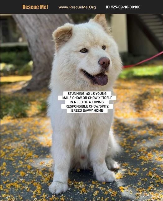Courtesy Posting: ORANGE COUNTY, CA (IRVINE IN S CAL)- STUNNING, 40 lb YOUNG MALE CHOW OR CHOW X 'TOFU' IN NEED OF A LOVING, RESPONSIBLE CHOW/SPITZ BREED SAVVY HOME Please help us find a chow or spitz or Asian breed savvy home for Tofu who was saved from the Riverside shelter by a good Samaritan and spent the effort to nurse him back to health. Tofu is estimated to now be 2.5 years young, perfectly sized at only 40 lbs, and has stunning and unique yellow/green eyes and may be mixed with another spitz breed such as Samoyed or husky too. Tofu has been living with another male chow for the past year, and has received training with the guidance of a professional trainer and can be very obedient when given clear instructions. We are told Tofu 'is friendly with people when properly introduced, he loves being petted but sensitive when people reaching over the top of his head. Neutral toward other dogs in public, slight case of resource guarding (do not feed near other animals) at home, improving with training'. Tofu also has good reports from where he goes to boarding and they describe him as a sweet boy who loves his walks and food. However, we understand he did have a minor bite initially when someone grabbed his collar suddenly, and more recently when he was startled from being asleep. Neither bite required stitches, but he is recommended to continue with training and to go slowly with new people, particularly over his head. Since Tofu is said to be very food motivated, please keep food bowls separated from other dogs, and a meet and greet with another dog would be required. No children are recommended in the home. Tofu is potty trained, current on shots and neutered. His current home says he is also low energy in the house and enjoys sleeping, but energetic when playing and training. Tofu is walked three times a day around 30 mins each time. Moderate walks are good enough to burn his excess energy. We have nice videos of Tofu interacting with people and the larger chow he lives with currently. If you are chow/spitz or Asian breed savvy and are interested in meeting and adopting Tofu, please contact [email protected] or Southern California Chow Chow Rescue Network who is trying to assist with his placement. All adopters will be asked for a home check (which may be virtual), an application, a vet reference, proof of prior chows, and a signed adoption contract. We will be posting more pictures and some adorable videos on facebook at: https://www.facebook.com/debbie.alder.14/posts/pfbid027TMA1ApB2MWg2P8DgYuSXfq6c6pusFx3AmpN3ePQkrHiLTU7sMVmWGzeeRUCMjaFl Note: to view contents of link you will need to copy and paste it into your browser