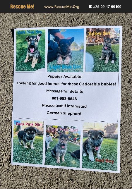 I rescued a German Shephard and later found out is was pregnant resulting in nine puppies. I have these six left to find homes for. They are going on nine weeks old. A DNA test did show they have 16% Siberian Husky.