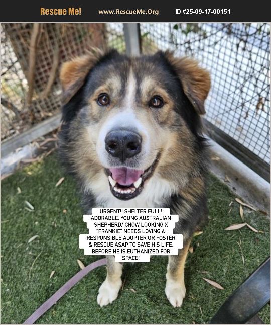 Courtesy Posting: URGENT AT LA CITY SHELTER WHICH IS FULL - LOS ANGELES ANIMAL SERVICES- SOUTH LOS ANGELES SHELTER- ADORABLE, YOUNG AUSTRALIAN SHEPHERD/ CHOW LOOKING X 'FRANKIE' ID #A2212965 NEEDS LOVING AND RESPONSIBLE ADOPTER OR FOSTER AND RESCUE ASAP TO SAVE HIS LIFE, BEFORE HE IS EUTHANIZED FOR SPACE! Help! This LA City shelter is full, and Frankie has been declining the shelter environment and his kennel since being found as a stray and ending up at the shelter on 8/1. He is a very handsome boy who is estimated to be 3 years young and weighs only 56 lbs so he is perfect size. Listed and likely mislabeled as german shepherd/chow mix, Frankie has sadly been overlooked. With his gorgeous tri color markings, he resembles an Australian shepherd, possibly with some chow. The shelter neutered him shortly after coming into the shelter, but after that, he came down with an URI and was placed on antibiotics for several weeks, and only was finally marked clear as of 9/7. Now that he is feeling better, he did much better in playgroup on 9/15, but was previously noted as being less tolerant of males and giving warning signs for space. Therefore, if you have another dog, a slow introduction is highly recommended, and calm dogs and females or no dogs may be best. A full copy of his medical and behavior notes are available. If you are interested to adopt this stunner, please contact the shelter directly by calling or using the listing link or by calling (888) 452-7381. Listing link: https://24Petconnect.com/DetailsMain/LACT3/A2212965 If you can possibly foster, please contact [email protected] asap or Southern California Chow Chow Rescue Network who is trying to assist the shelter with their placement. Please note rescue groups typically need a foster to save a dog. We will then try to pair you with a willing rescue group in time. We will be posting additional photos and videos on his FB page at: https://www.facebook.com/debbie.alder.14/posts/pfbid0ZQA21RV89BBN1KeMJz8kBWGav1dbB7mL1wmNea7dAGR1AP6UoqrLsfcBy6TfJital NOTE: to view contents of links you will need to copy and paste each one separately into your browser.