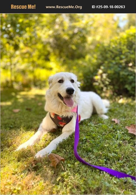 Stella is a 1.5 year-old Great Pyrenees who has already come so far on her journey! She sports a gorgeous and soft white coat with the most perfect expert eyeliner adorning her look-deep-into-your-soul eyes. When she first arrived, she was extremely malnourished at just 50 lbs! Thanks to good nutrition, great foster mom, and her own resilient spirit, she's gaining weight like a champ, she's up to 75lbs so far, and is blossoming into the goofy, loving girl she was always meant to be. Stella just finished her heartworm treatment and is recovering under the watchful eye of her foster mom (yes she's spoiled rotten, thank you!) She'll need a forever home soon, to help her continue putting on the weight! But she makes it so easy! She's very food-motivated. Chicken? Umm... Yes, please! Did we mention she is also eager to please? The whole package! This gentle girl is wonderful with kids. She adores being part of the action, happily following children around the house and even quickening her pace to keep up with them on walks. Stella is affectionate and calm, just as happy to soak up pets as she is to flop on her back for a belly-up snooze. She is crate trained, dog- and cat-friendly, and is working on her leash manners. With patience and consistency, she's sure to pick it up quickly-especially if snacks are involved! Stella is ready for her next chapter with a family who will give her the love, structure, and encouragement she deserves as she continues to thrive. VERY IMPORTANT NOTE: Stella can jump over and clear a five foot fence! Like an acrobat! Our adoption radius is within 60 miles of zipcode 20906 Click here to apply and live happily ever after: https://tinyurl.com/TLCdogapp