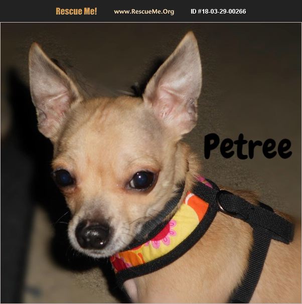 Petree is a sweet three-year-old Chihuahua Mix who came to Puppy Pals Rescue from a Kentucky shelter along with four other dogs. He arrived in a very underweight condition - his ribs and spine showed and he only weighed five pounds - he did not have any body fat. During his time in his foster home he has started eating a good diet and now weighs six and a half pounds. He continues to eat well and I am guessing a good weight for him would be about eight pounds. This little one has a very loving disposition and is a very happy boy. He enjoys giving people kisses - even strangers - and loves to rest by your side. Petree also enjoys playing with his foster brothers and sister and loves to chase a toy that is thrown to him. He is very active and loves to play. He does well with kids and also dogs. He just stares at cats, but does not try to chase them - although he does try to eat the cat food. He walks well on a leash. When Petree arrived at his foster home he had zero potty manners. By crate training him, Petree is 90% potty trained and is well on his way to 100%. He sleeps in a crate at night and has not soiled his crate. Petree is a handsome fellow and has a short tan coat with a brown stripe down his spine from his neck to the end of his tail. His big brown eyes show his loving nature. Petree has received all his shots, been neutered, heart worm and fecal tested (both results negative), micro chipped, and given his heart worm and flea prevention while at Puppy Pals Rescue. He has been examined by a veterinarian and given a physical and other than being underweight, no problems were found. Because of his small size and active nature, a fenced yard will be required to adopt Petree. I am working with him on his commands and so far he will come when called, walk on a leash, and sit on command (60% of the time). Petree seems to be a quick learner so training classes would be good for him. Petree would do great with a retired person or a family with older children. Petree is one loving pup and would be a great family addition. Feel free to email me with any questions. Petree��%BD'��%BD| looking for a great forever home. If you have any questions, please contact the foster home at the link found at http://puppypalsrescue.com/Dogs_Petree1816.html. Fill out an application if you are interested in adopting this pup - you can find those at http://puppypalsrescue.com/Applications.html. (Email the foster home and let them know you applied so they can be sure the application is received!)
