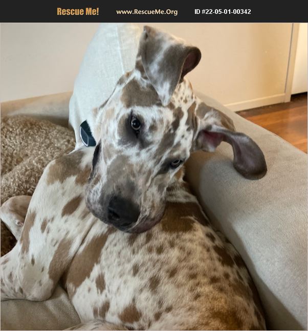 9 month old purebred Great Dane. Rare coloring. Mostly housebroken, occasional accidents. Has been neutered and has trope y completed. Will be due for vaccinations at one year. Was rescued from an owner who neglected him. Needs to continue to gain weight but is doing very well.