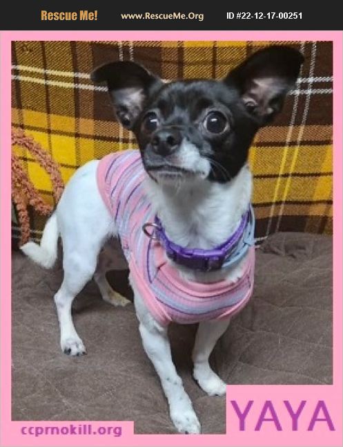 ONCE THIS PET IS ADOPTED: THIS AD WILL BE REMOVED. Please read full ad prior to contact. This organization does not adopt to people who waste our time asking questions about pets that are answered here in the pets ad.-- YA YA. Spayed female rat terrier/chihuahua mix. under 8.9 lbs. Vaccinations current. Current on Heartworm and flea preventions. Perfect little lap dog. Somewhat fearful of small children (under 7 yrs.) Crate, house and dog door trained. Never met a stranger. Likes both men and women. SMALL DOGS ARE NOT SUGGESTED AS PETS FOR CHILDREN! BECAUSE CHILDREN ARE OFTEN NOT OF MATURE MIND AND TEND TO HURT OR ABUSE SMALL DOGS WHEN THEY DO NOT HAVE PARENTAL SUPERVISION! Adoption fee is $175.00 + $25.00 Microchip fee with approved application. The application to adopt can be found at CCPRNOKILL.ORG or you can request one via email at [email protected]. Discounts available for those who qualify. ALL TRANSPORTATION EXPENSE, SET UP, COORDINATION, CERTIFICATIONS, CARRIERS, EXPENSE, ETCETERA ARE THE SOLE RESPONSIBILITY OF THE ADOPTER. WE SUGGEST CITIZENSHIPPER.ORG