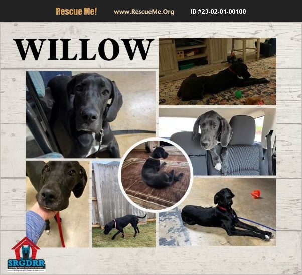 LOCATION: Catonsville, Maryland DOB: 02/14/2022 Let's give a warm welcome to our new friend, Willow! Willow is a beautiful girl with a loving personality who likes to get attention and is sure to draw attention with that gorgeous black coat she wears and those long, slender legs (that seem to have grown faster than Willow anticipated. Her foster momma says watching her on the stairs is a riot.) She is a Velcro Dane so if you are looking for a lovebug, you got it with Willow. She is super smart and knows the commands Sit and Down (for a treat of course), Drop (when playing fetch), Off (as in Willow, off the furniture), Paw and Trade. Chewing on comforters and towels is comforting for her, so her foster mom uses the Trade command to switch the blanket out for a favorite chew toy. And if she is needing to get your attention or she wants to get back into your good graces (maybe after a little antic or misbehavior) expect her to reach out with her paw. It's like her very own olive branch. This beautiful lady is a ball of energy and has mastered the art of zoomies and playing fetch. She loves warm baths and she will tolerate her teeth being brushed (although she can think of other more interesting ways to pass the time than having her toofers cleaned-such as investigating open doors or perusing unclosed trash cans.) Sweet Willow will need to be the only dog in the home. She was attacked by a dog in the past and she has become fearful and she now shows aggression towards other dogs. Cats are probably a no as well. She has been around chickens at her foster home and shows curiosity but the chickens remain in a penned area. Loud noises like fireworks are scary for her. She loves humans of all ages and heights, even babies, and gets excited when new people come to visit. With any large-breed, slow and proper introductions are important though. Also, she can get mouthy when she is playing so supervision with children is necessary. Miss Willow sleeps all night in her kennel and she will take her after lunch nap in the kennel space as well. She is housetrained. Leash training is a work in progress. She is still a youngster who can get into mischief if left unsupervised. Some Danes are slobbery and a drool flinger. Not Willow! Clean as a whistle. She's not even a licker nor is she food aggressive at all. She knows to wait patiently for her food bowl to be set down. She would love a family that will take her for car rides and maybe go to the park with her. When she is at home, though, birds and squirrels, trucks and passers-by beware. Her conversations are one-sided and she has a very loud and commanding voice. Willow is an absolute catch. Her foster parents say she is wonderful and will make a great family dog. Maybe that family is YOUR family? Willow would sure be interested in finding out! ========================= To apply to adopt me, please fill out the application form! https://form.jotform.com/51994996709176 .